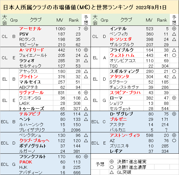 (MVとクラブ世界ランキング:2023年9月1日現在の値で固定)