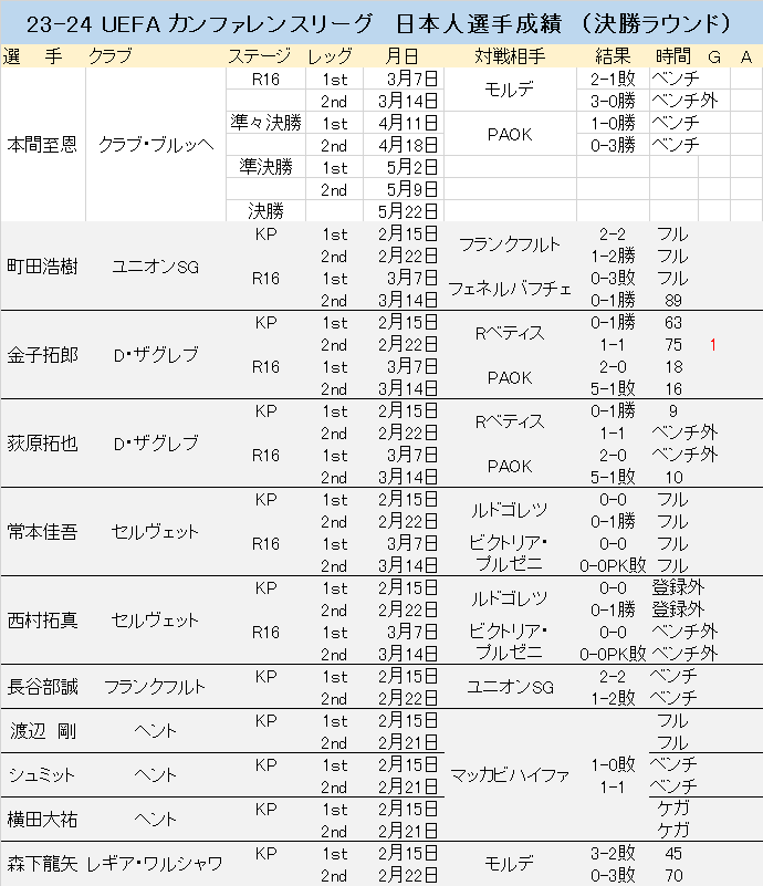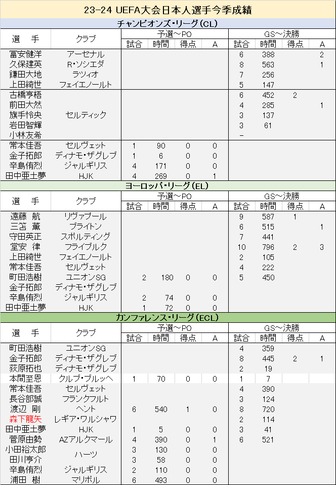 - 24-25 UEFA大会(CL・EL・ECL)出場日本人選手一覧と成績